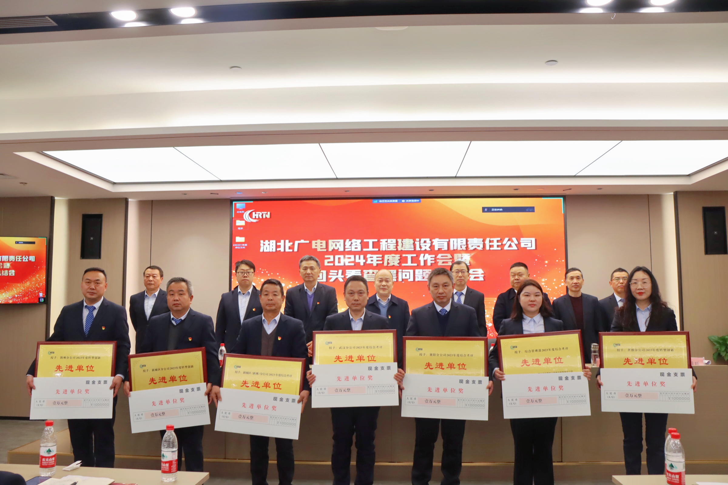 会议表彰了2023年度股份公司及工程公司先进单位和先进个人,组织学习了《湖北广电网络工程建设公司绩效考核管理办法(2024年度)》等近期重要文件,并通报“回头看”查摆问题、保驾护航经营发展主题活动成果。袁哲同志与系统集成分公司、钢构市政分公司、数字公司、大市场专班签订目标考核责任书,金伟、姚维斌、谢江涛等同志与恩施、十堰、江汉分公司签订帮扶责任书。孝感、襄阳、新城区(新洲)分公司作典型发言,系统集成、钢结构市政、大市场专班、数字公司、鄂东分公司作表态发言。