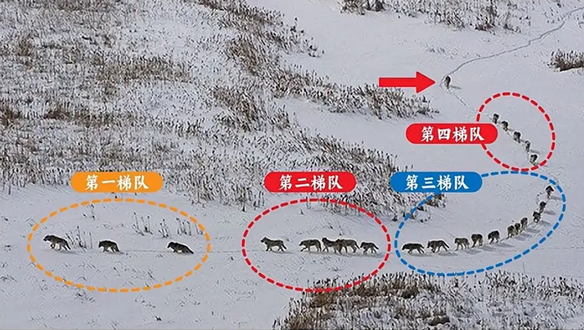 在这幅图中,狼群的队伍主要分成5个部分。走在最前面的第一梯队是老狼和病狼,一是避免掉队,二是控制整个队伍前进的速度和节奏。第二梯队是最强壮、最厉害的狼,如果狼群受到攻击,可以及时保护前翼。第三梯队是妇女儿童梯队,受到前后梯队的保护。第四梯队的也是最强壮、厉害的狼,保护狼群的后翼。走在队伍最后面的是狼王,一边观察前面一边断后,并确保狼群里没有任何狼掉队。