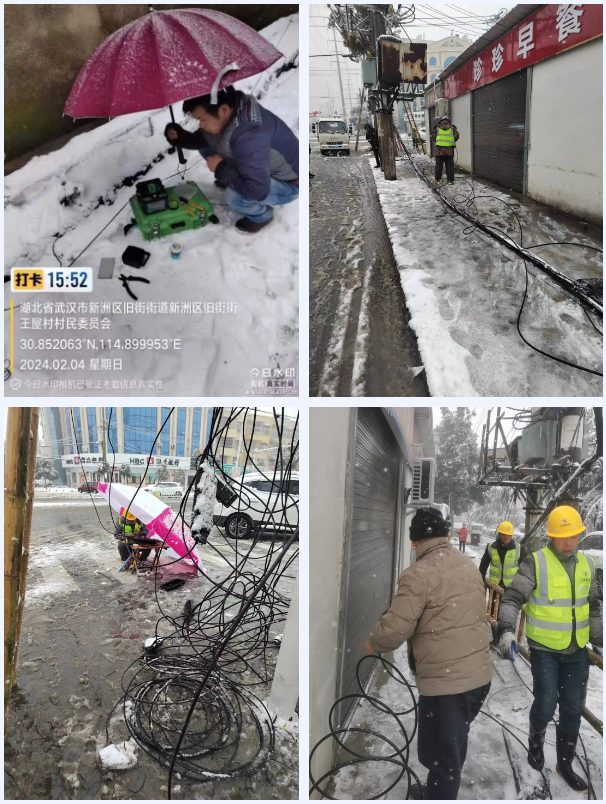 自2月2日晚出现冻雨天气,武汉市新洲区太和村、团强村、王屋村等地出现大面积断杆、倒杆,严重影响了当地居民的通信网络信号。冰天雪地中,新洲分公司的抢修人员冒雪前行,克服道路积雪结冰、行车受阻等重重困难,开展线路巡检与宽带维修工作,对受损严重的倒杆、断杆进行抢修,及时处理光缆故障,尽最大努力降低故障发生率,确保网络运行平稳。 目前抢修工作仍在持续进行中。